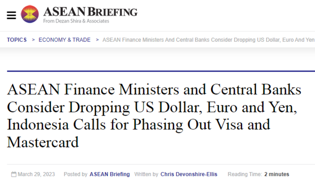 据“东盟简报”网站29日报道,3月28日周二,东盟各国财长和央行行长正式会议在印度尼西亚开幕。会议的首要议题是讨论如何减少金融交易对美元、欧元、日元和英镑的依赖,转向以当地货币结算。